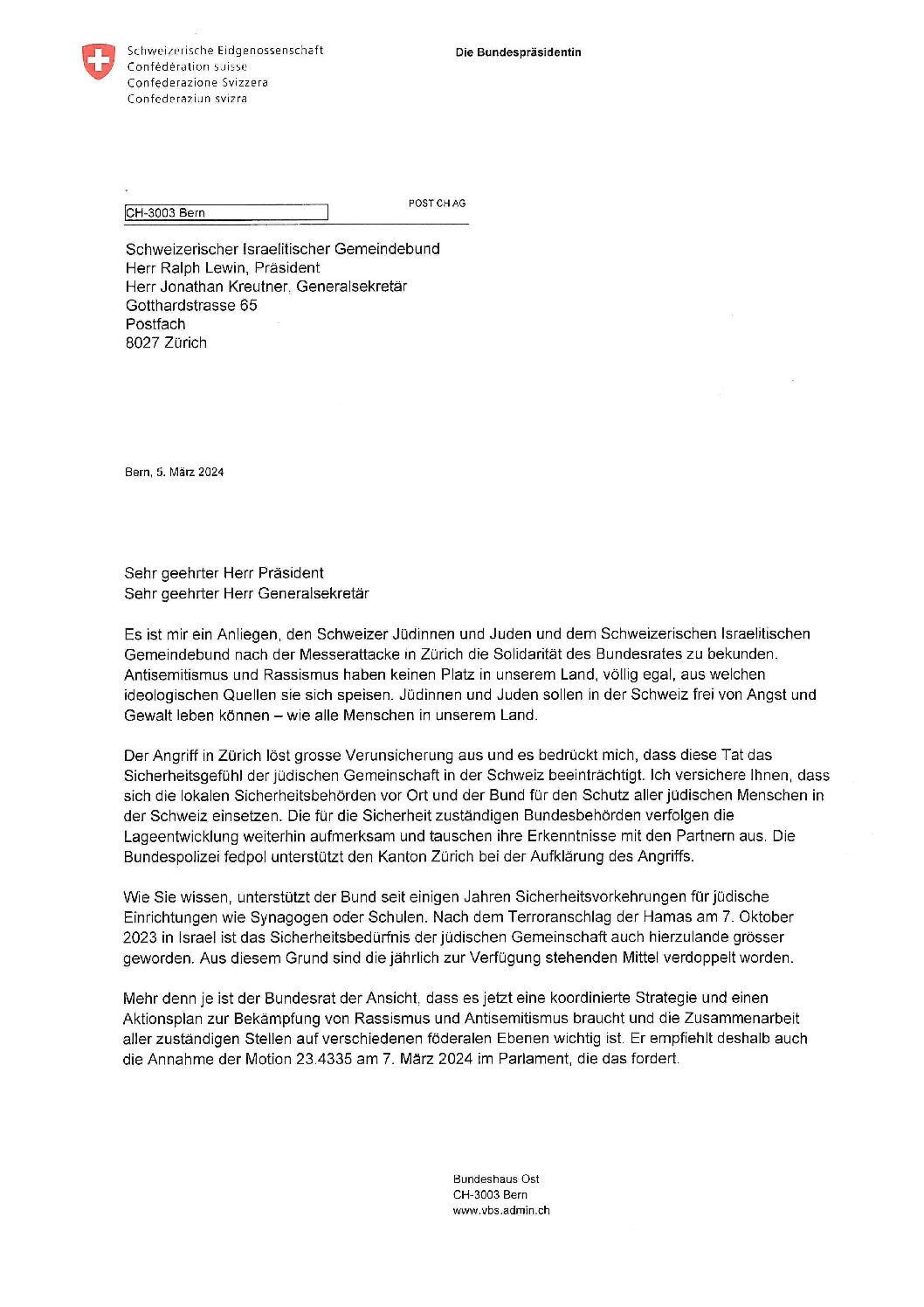 Die Bundespräsidentin Viola Amherd zeigt sich im Namen des Bundesrates mit einem Schreiben vom 5. März 2024 an den SIG solidarisch mit den Schweizer Jüdinnen und Juden.